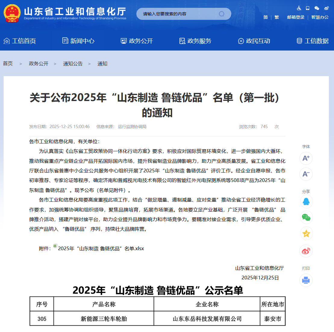 12月25日,山东省工业和信息化厅公布了2025年度“山东制造 鲁链优品”名单(第一批),东岳轮胎生产的新能源电动三轮车轮胎成功入选榜单。这不仅是对企业制造实力和产品品质的肯定,更是集团持续推动创新、深耕品牌价值的体现。