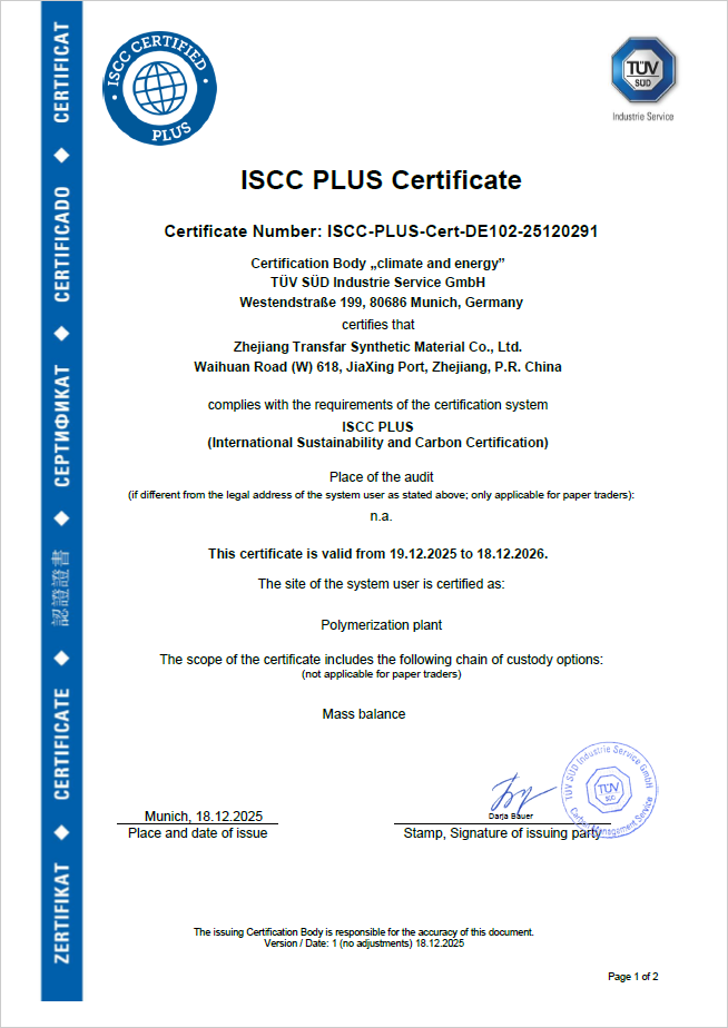 近日,浙江传化合成材料股份有限公司成功通过ISCC PLUS认证复审,新版认证证书已正式启用。这标志着传化合成在可持续管理体系的持续运行与优化上,再次获得国际权威机构的认可。